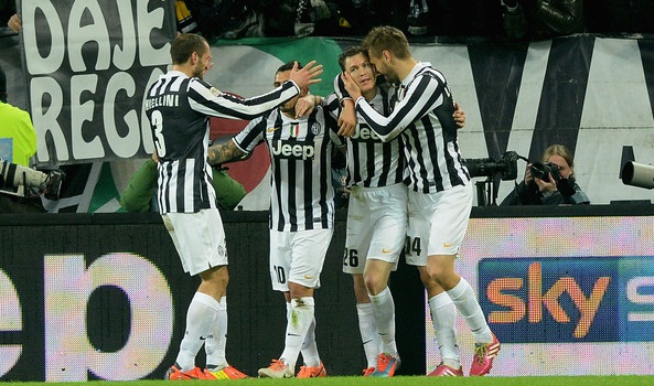 Những diễn biến trên sân Juventus Stadium cho thấy sự chênh lệch rõ ràng giữa hai đội. Juventus nhập cuộc tốt hơn và sớm có bàn mở tỷ số. Phút 15, Andrea Pirlo tung ra đường chuyền tinh tế, để Stephan Lichtsteiner đánh đầu tung lưới Handanovic, đem về bàn mở tỷ số cho đội chủ nhà. Sau bàn thắng này, Juventus liên tục tạo ra những cơ hội nguy hiểm, với những nỗ lực của Pogba và Tevez. Đáng tiếc là nhà ĐKVĐ Serie A không thể ghi thêm bàn thắng trong hiệp một.