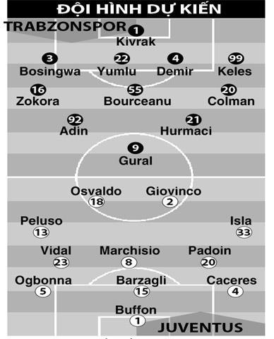 Rõ ràng, trận gặp Milan được đặt lên trên cuộc chạm trán Trabzonspor đêm nay. Điều này cũng dễ hiểu khi Juve cần bứt tốc tại Serie A trong khi họ đã có lợi thế to lớn về tỷ số trước đại diện Thổ Nhĩ Kỳ. Theo đó hàng loạt trụ cột sẽ được cho nghỉ đêm nay như Pirlo, Pogba, Llorente, Tevez, Asamoah, Lichtsteiner, Bonucci. Tiền vệ Vidal do bị treo giò trận gặp Milan sẽ được ra sân từ đầu trên đất Thổ Nhĩ Kỳ.